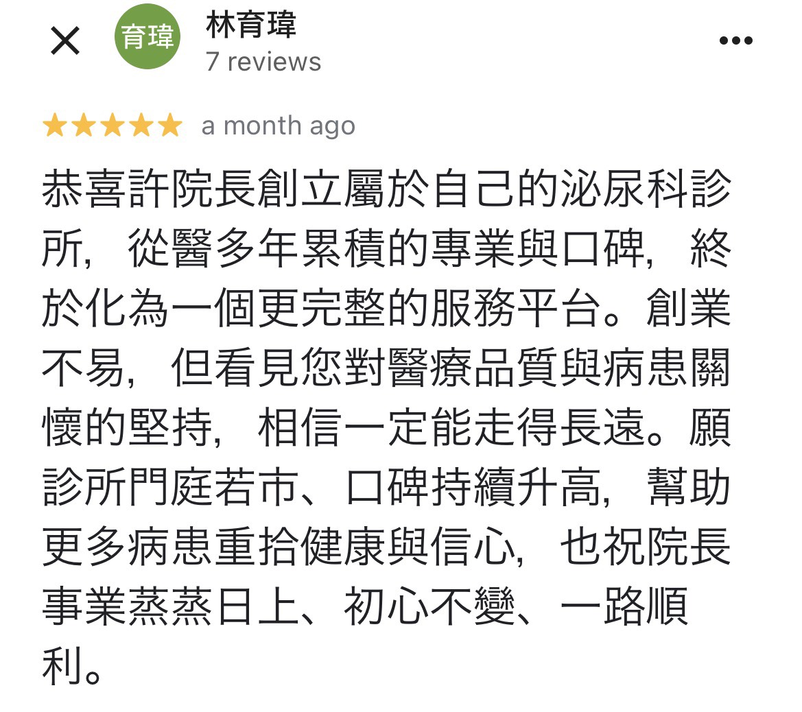 恭喜許院長創立屬於自己的泌尿科診所,從醫多年累積的專業與口碑,終於化為一個更完整的服務平台。創業不易,但看見您對醫療品質與病患關懷的堅持,相信一定能走得長遠。願診所門庭若市、口碑持續升高,幫助更多病患重拾健康與信心,也祝院長事業蒸蒸日上、初心不變、一路順利。