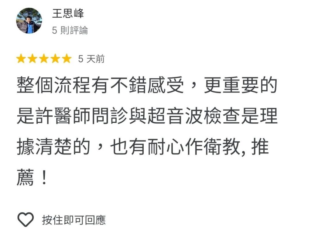 整個流程有不錯感受,更重要的是許醫師問診與超音波檢查是理據清楚的,也有耐心作衛教, 推薦!