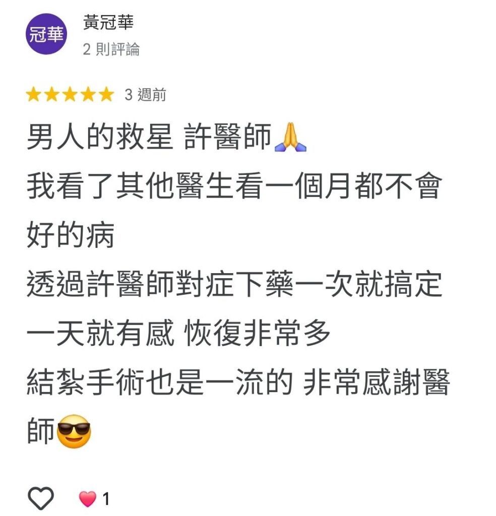 男人的救星 許醫師🙏 我看了其他醫生看一個月都不會好的病 透過許醫師對症下藥一次就搞定 一天就有感 恢復非常多 結紮手術也是一流的 非常感謝醫師😎
