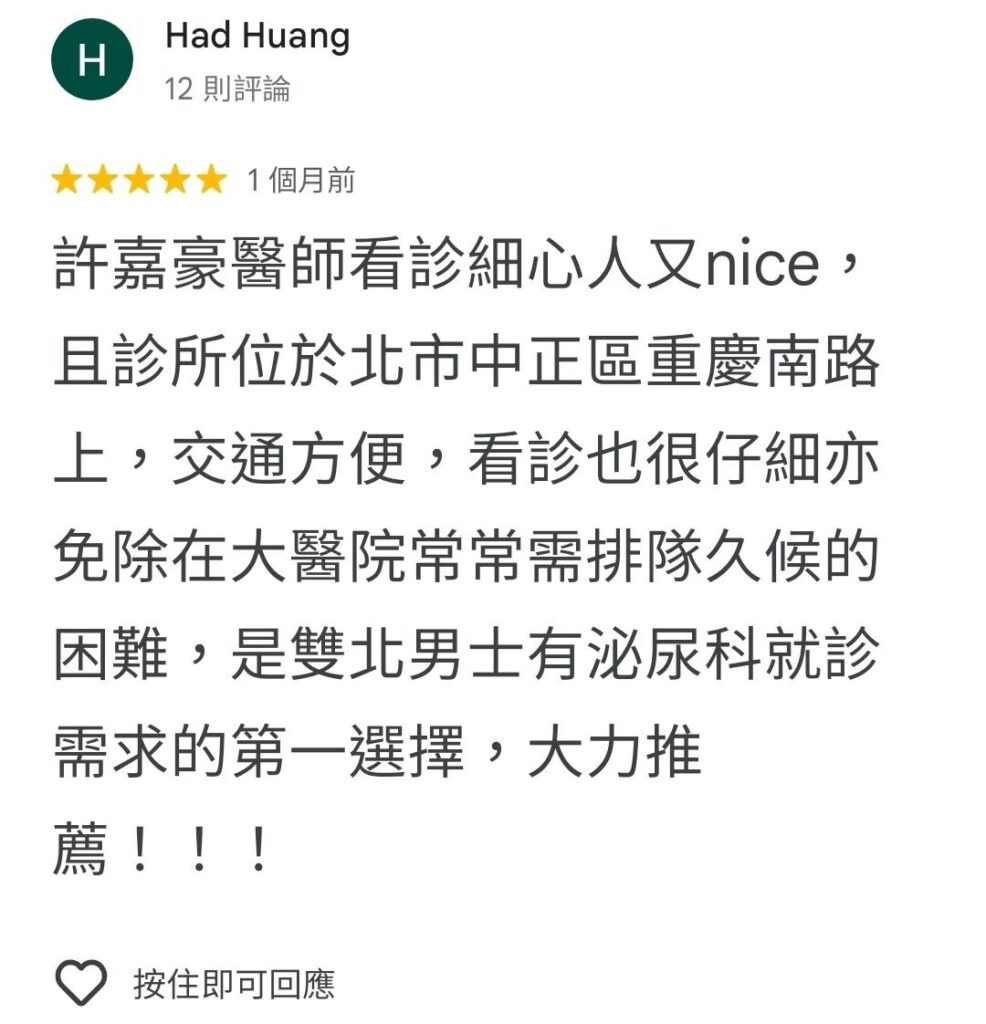 許嘉豪醫師看診細心人又nice,且診所位於北市中正區重慶南路上,交通方便,看診也很仔細亦免除在大醫院常常需排隊久候的困難,是雙北男士有泌尿科就診需求的第一選擇,大力推薦!!!