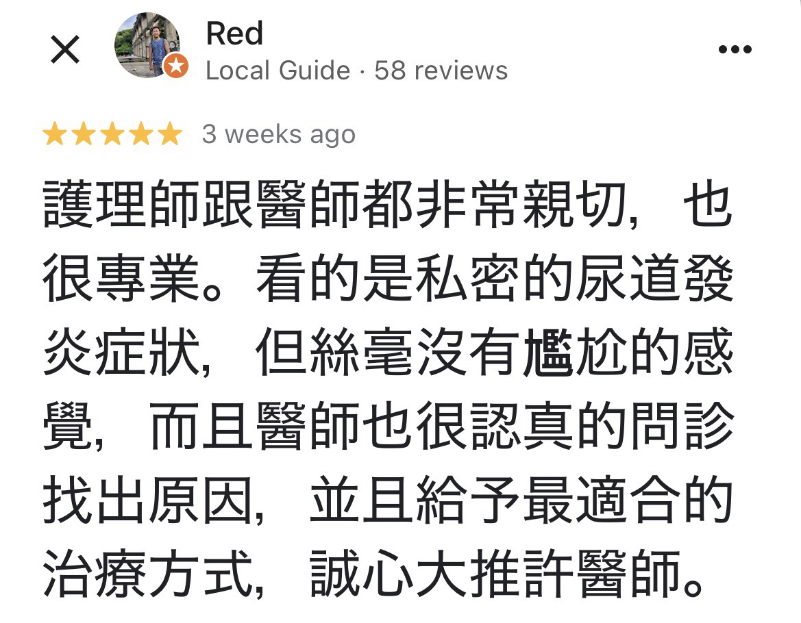 護理師跟醫師都非常親切,也很專業。看的是私密的尿道發炎症狀,但絲毫沒有尷尬的感覺,而且醫師也很認真的問診找出原因,並且給予最適合的治療方式,誠心大推許醫師。