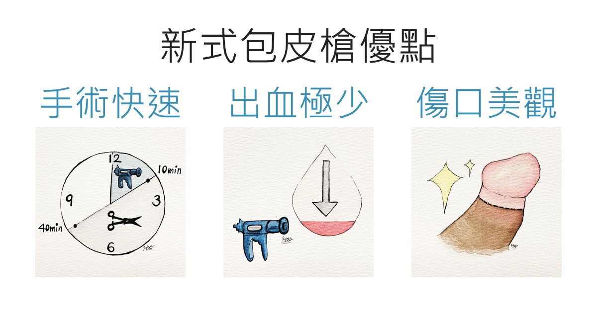 先送上懶人包:包皮槍用環形切割+釘合,一次完成切、止血、縫合,通常更省時、出血少。是否適合仍需泌尿科評估。