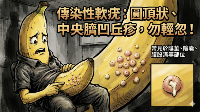 男性生殖器傳染性軟疣(Molluscum Contagiosum)是由病毒引起的表皮感染,特徵為中央具「臍凹」的光滑丘疹,雖非菜花且不會癌變,但具高度傳染性,接觸即可能傳播。