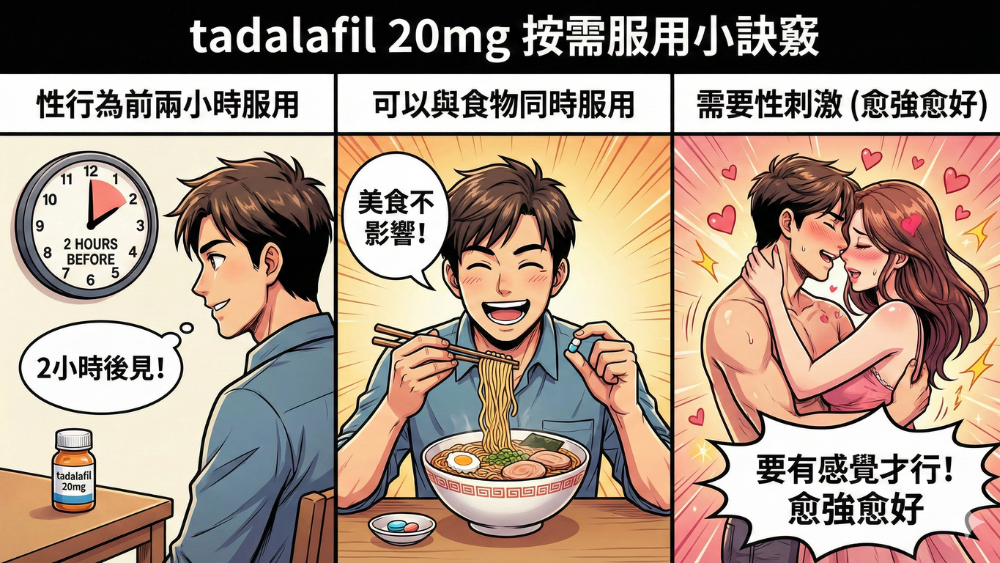 - 藥效可持續至約 36 小時(不是持續勃起,而是在此時間內較容易因刺激而勃起)
